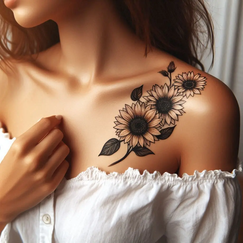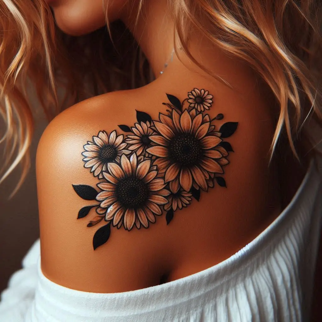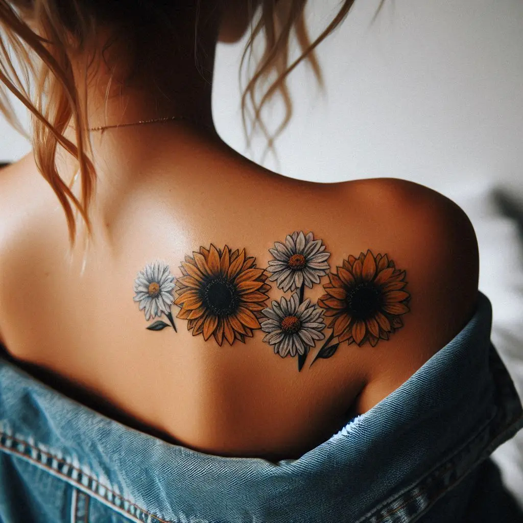 Tattoo Meaning: Sunflowers represent positivity, happiness, and strength, while daisies symbolize innocence and new beginnings.