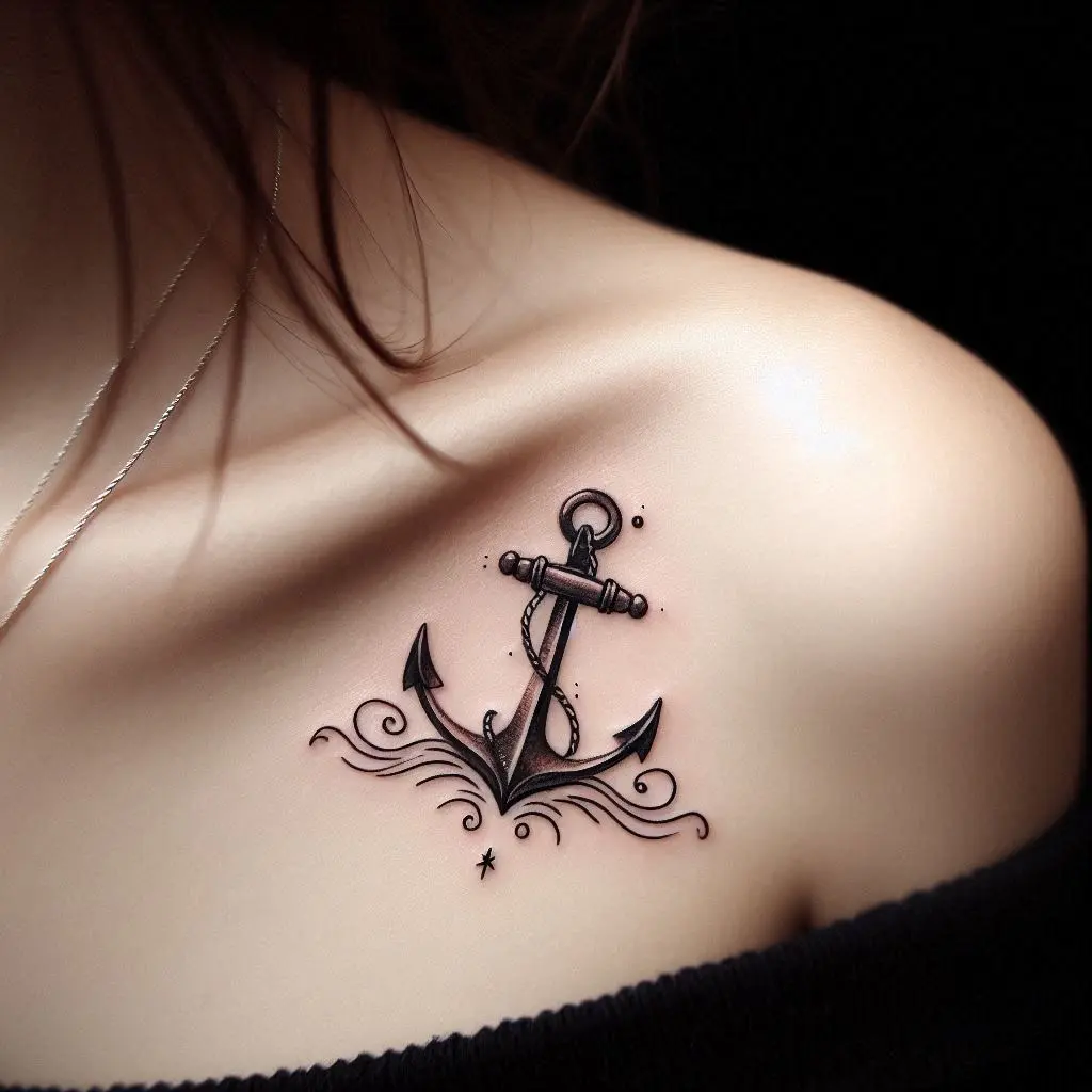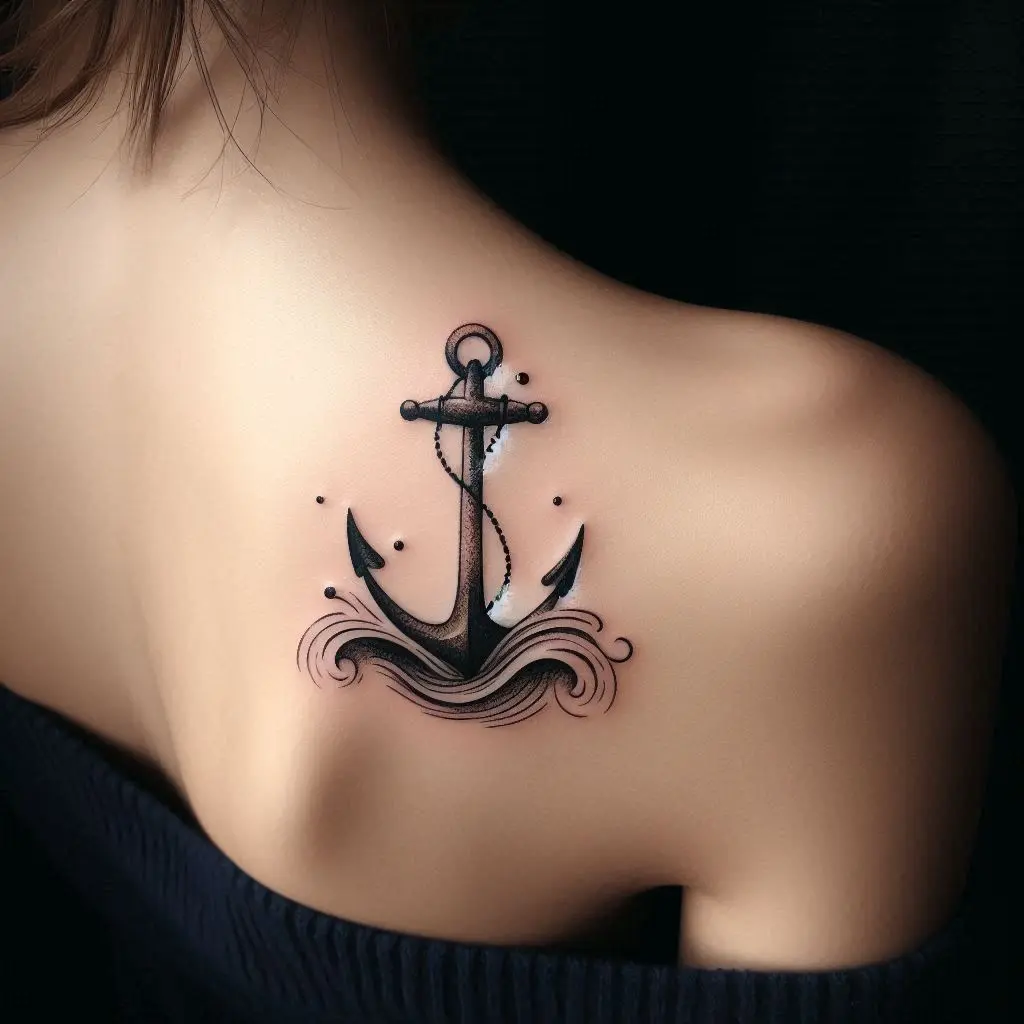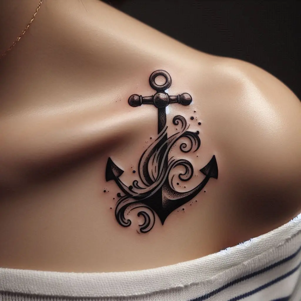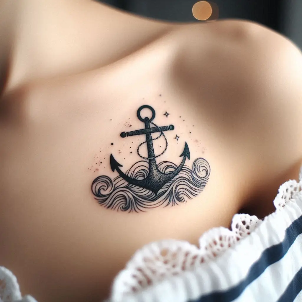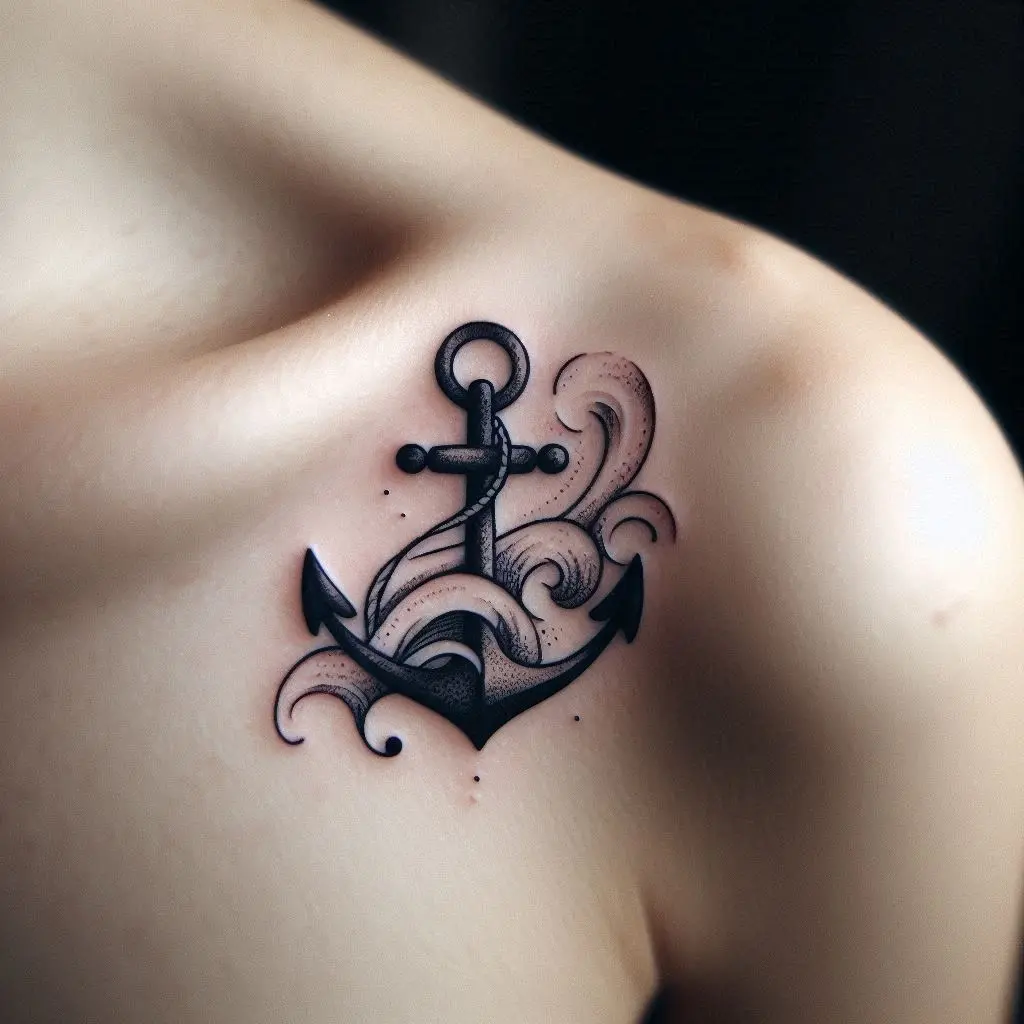 Tattoo Meaning: An anchor symbolizes stability, strength, and hope, while waves represent change and life’s constant motion.