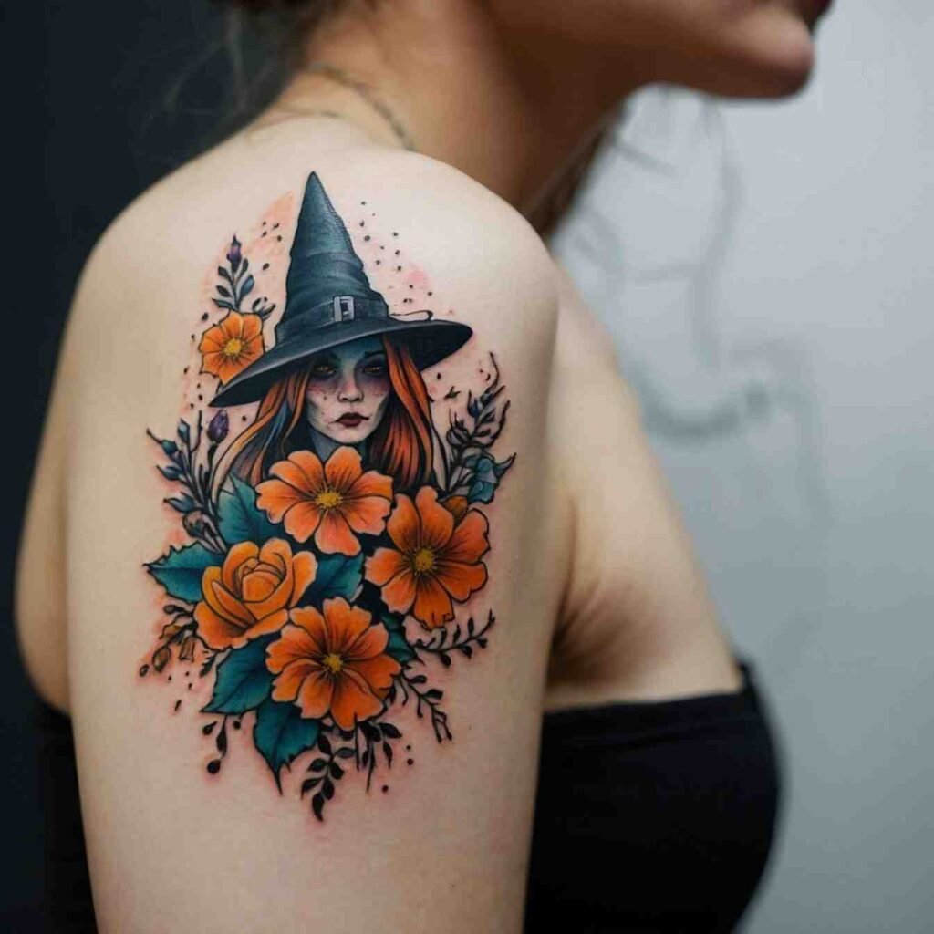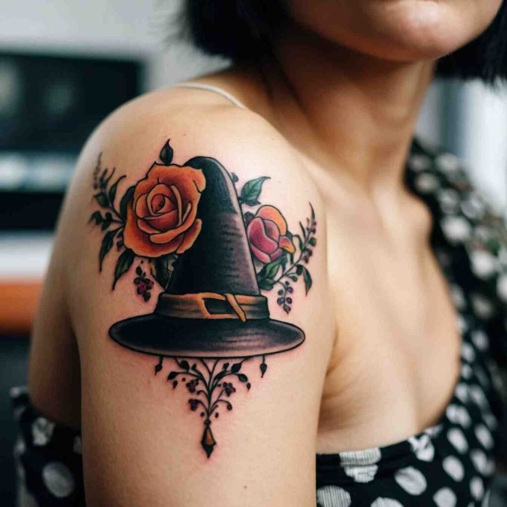 Floral witch hat tattoo blends the beauty of nature with the mystique of magic. The flowers symbolize growth, life, and the ever-changing cycle of the seasons. This design is ideal for those who appreciate the softer, more nurturing side of witchcraft. It’s a great way to combine femininity with a love for the magical, creating a tattoo that is both delicate and powerful.