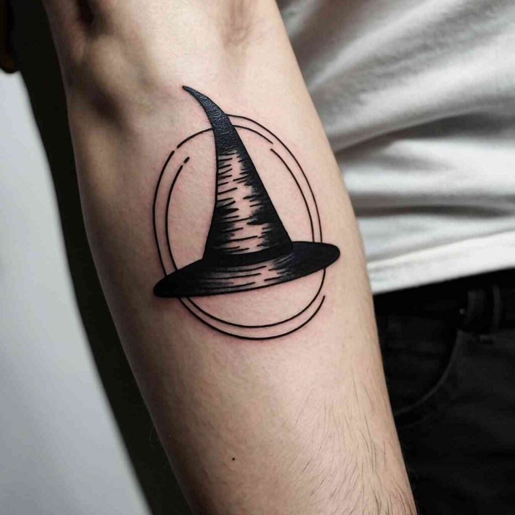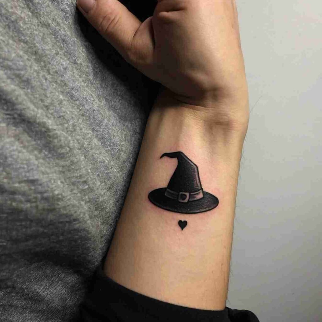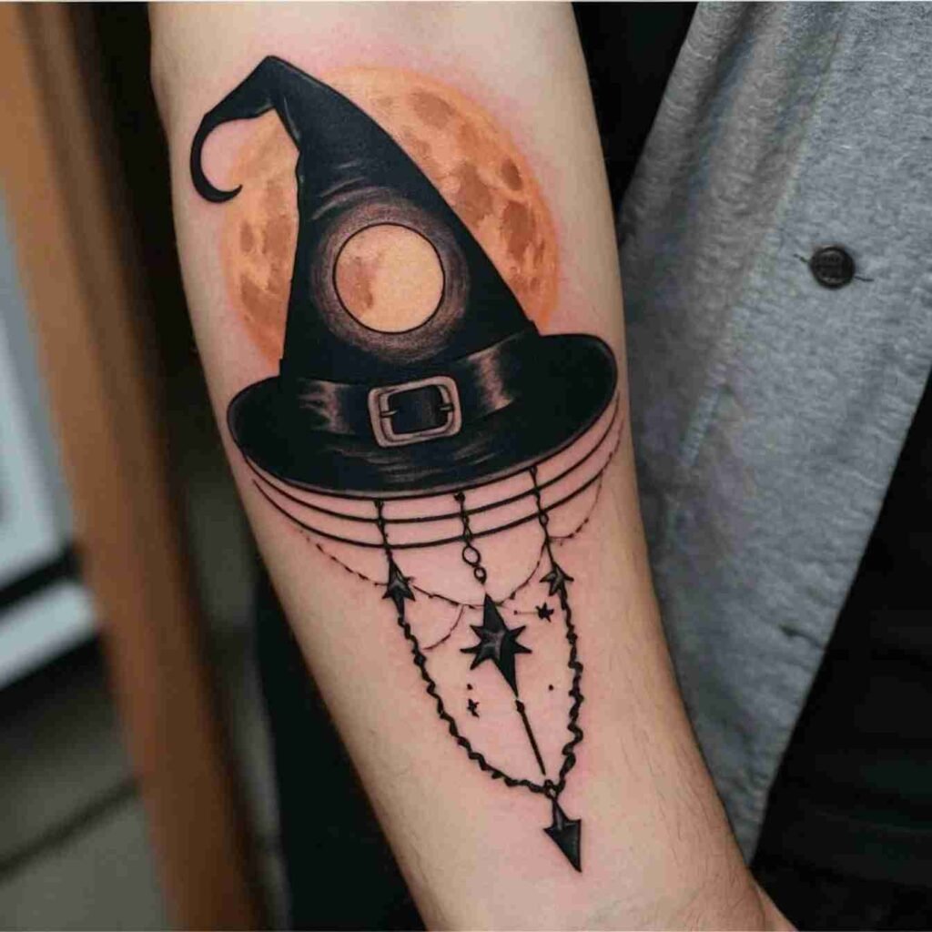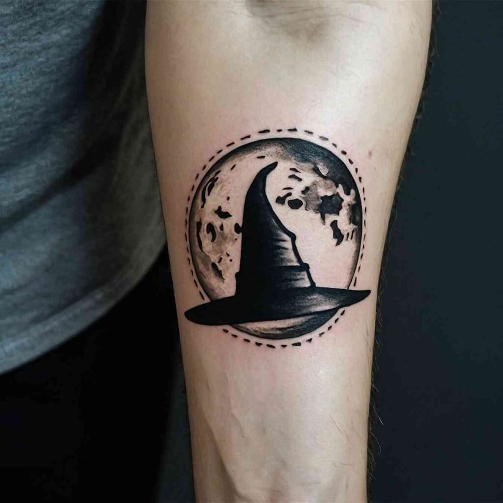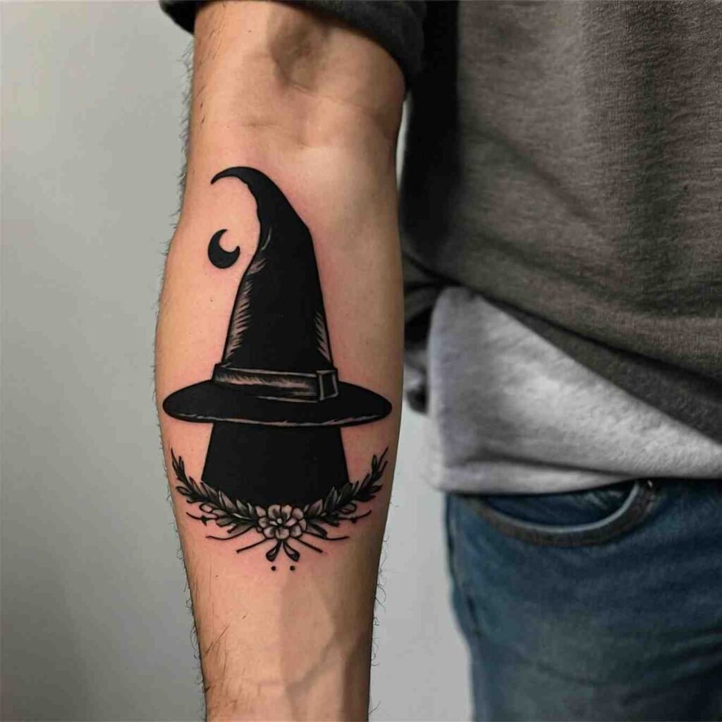 Combining a witch hat with a crescent moon creates a design that’s rich with symbolism. The moon represents intuition, the subconscious, and the mystical, making it the perfect complement to the witch hat. This tattoo is ideal for those who feel a strong connection to the lunar cycle or who want to highlight their intuitive nature. It’s a design that captures the essence of magic and mystery.