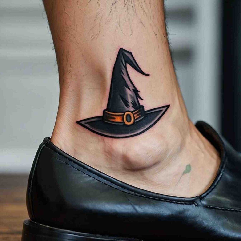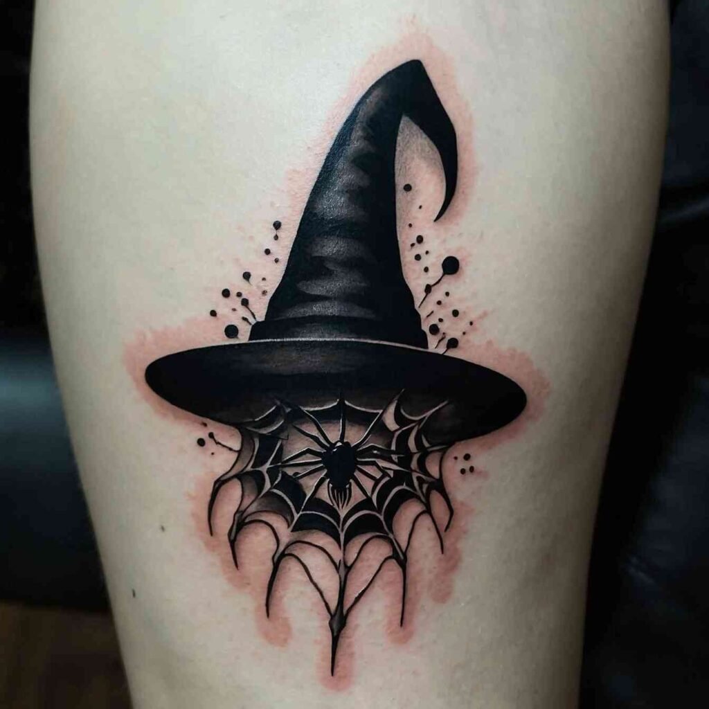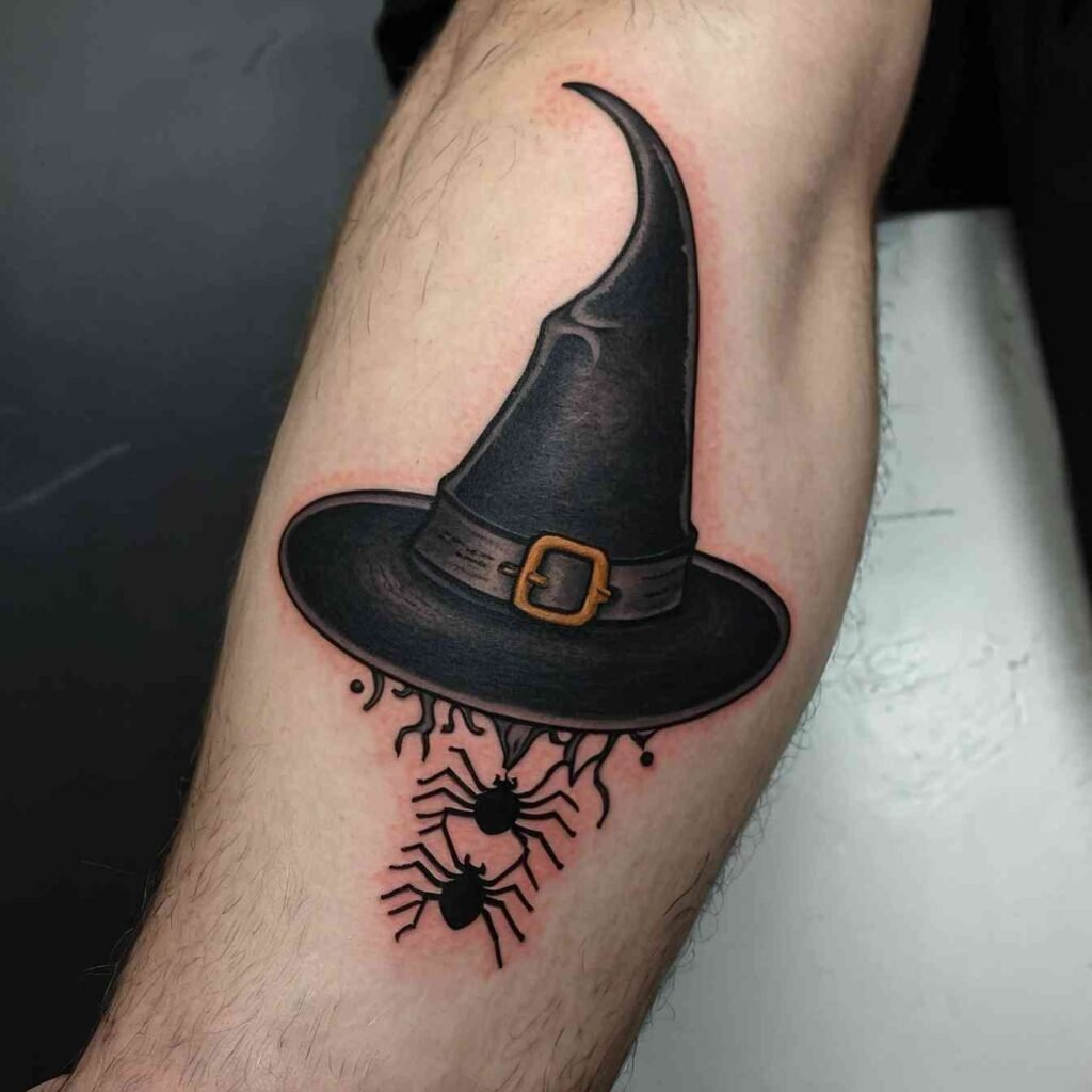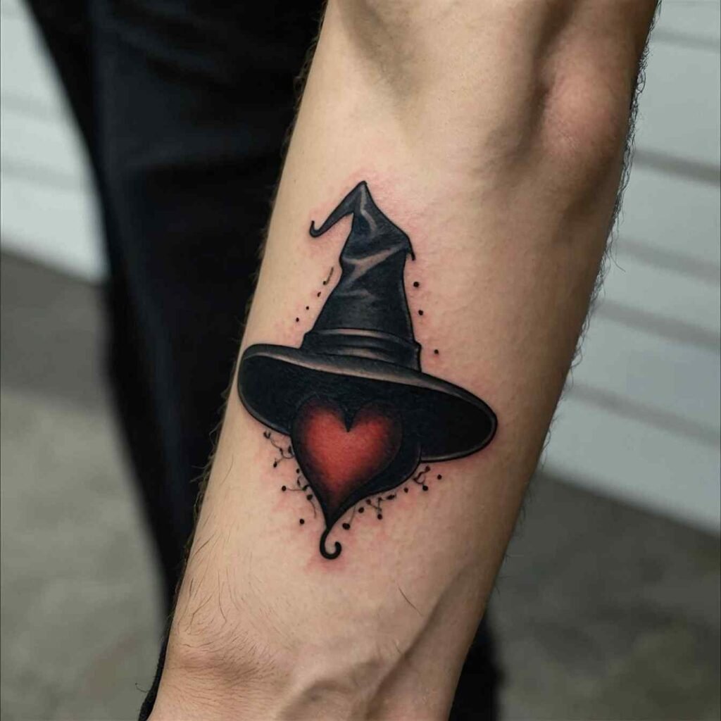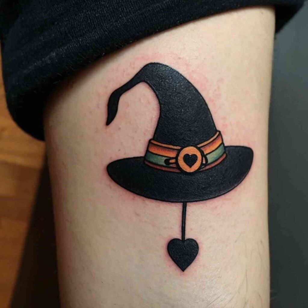 Combining a witch hat with a crescent moon creates a design that’s rich with symbolism. The moon represents intuition, the subconscious, and the mystical, making it the perfect complement to the witch hat. This tattoo is ideal for those who feel a strong connection to the lunar cycle or who want to highlight their intuitive nature. It’s a design that captures the essence of magic and mystery.