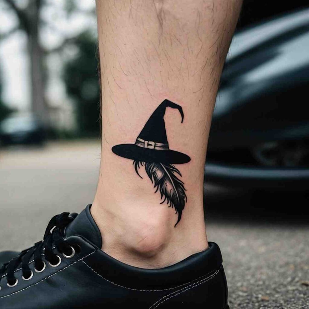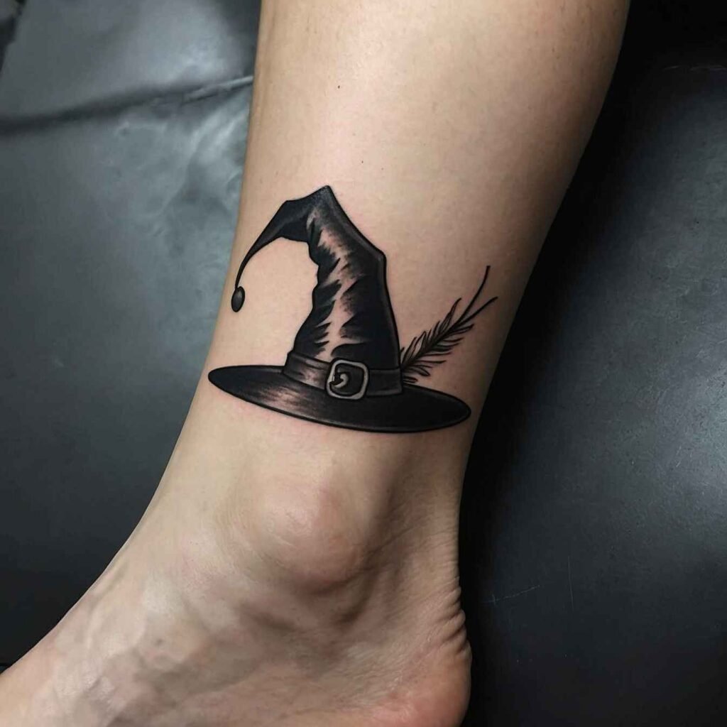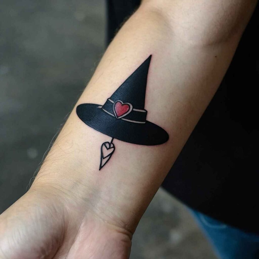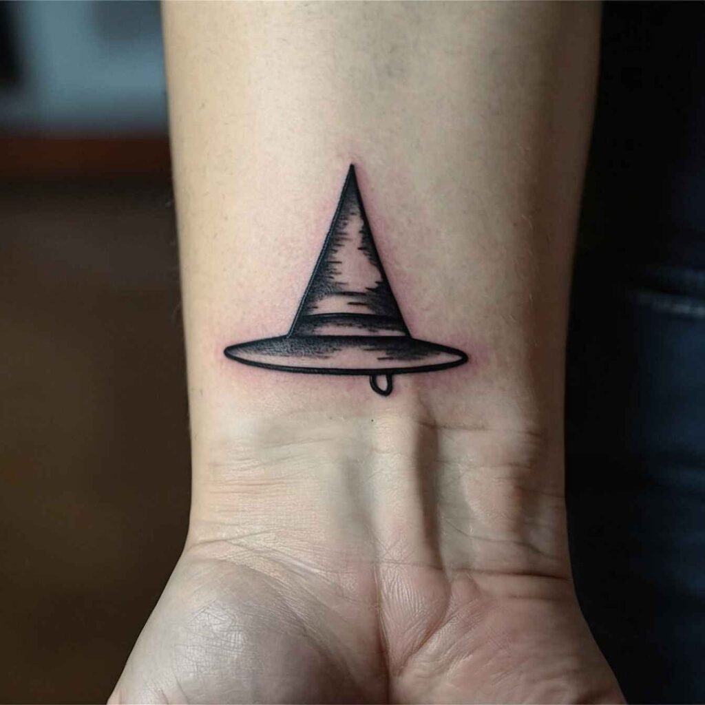 This witch hat tattoo, paired with a feather, symbolizes freedom and the connection to the spiritual realm. The feather adds a light, airy feel to the design, representing the ability to transcend the physical world. It’s a great choice for those who value independence and spiritual growth. The feather softens the witch hat, making this tattoo a delicate yet powerful representation of your free-spirited nature.