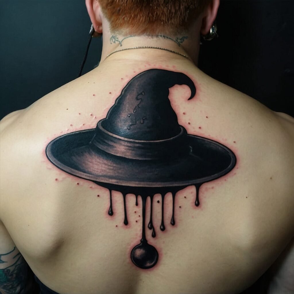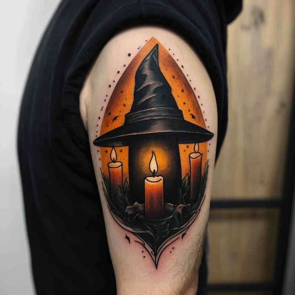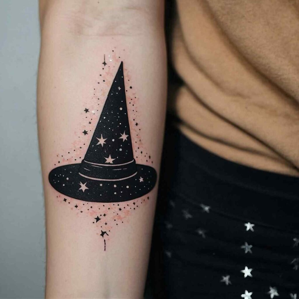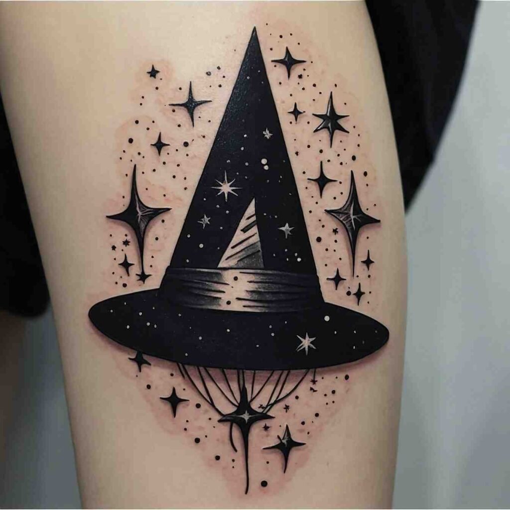 Incorporating stars around the witch hat adds a touch of celestial magic to your tattoo. This design represents guidance, the pursuit of dreams, and the belief in something greater. It’s a perfect choice for those who look to the stars for inspiration or feel a deep connection to the universe. The stars enhance the mystical feel of the witch hat, making this tattoo both enchanting and meaningful.