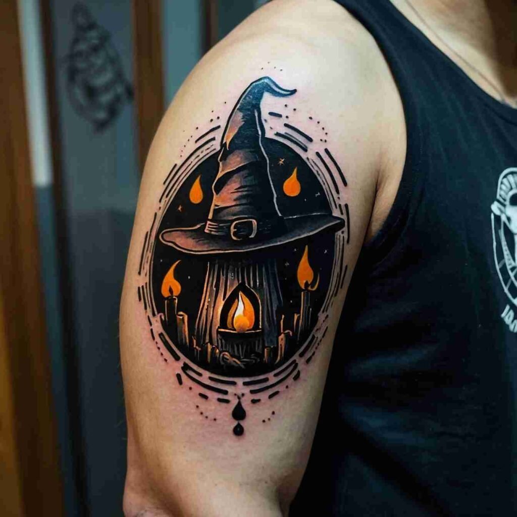 This witch hat tattoo, surrounded by candles, symbolizes enlightenment and the power of magic rituals. The candles add a sense of warmth and illumination, representing the guiding light of knowledge and the spiritual journey. It’s a design that’s perfect for those who are drawn to the ritualistic and spiritual aspects of witchcraft. The candles enhance the witch hat, making this tattoo both meaningful and visually striking.