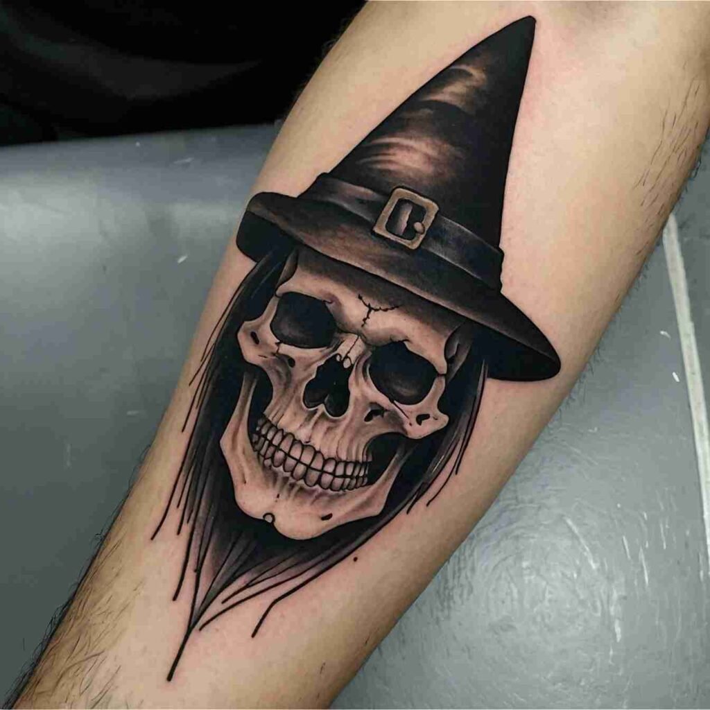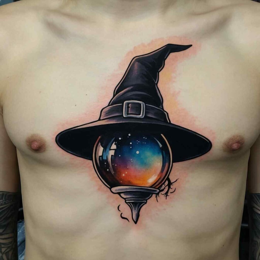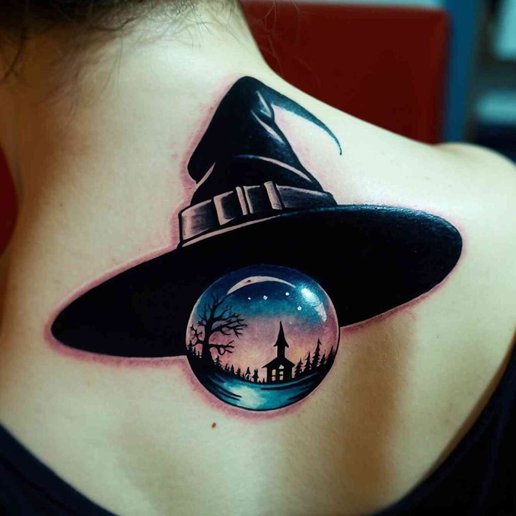 A witch hat paired with a crystal ball is a powerful symbol of divination and foresight. This tattoo is ideal for those who are drawn to the mystical arts and the power of seeing beyond the ordinary. The crystal ball adds an element of mystery and magic, representing the ability to look into the future and uncover hidden truths. It’s a design that’s both intriguing and deeply symbolic.