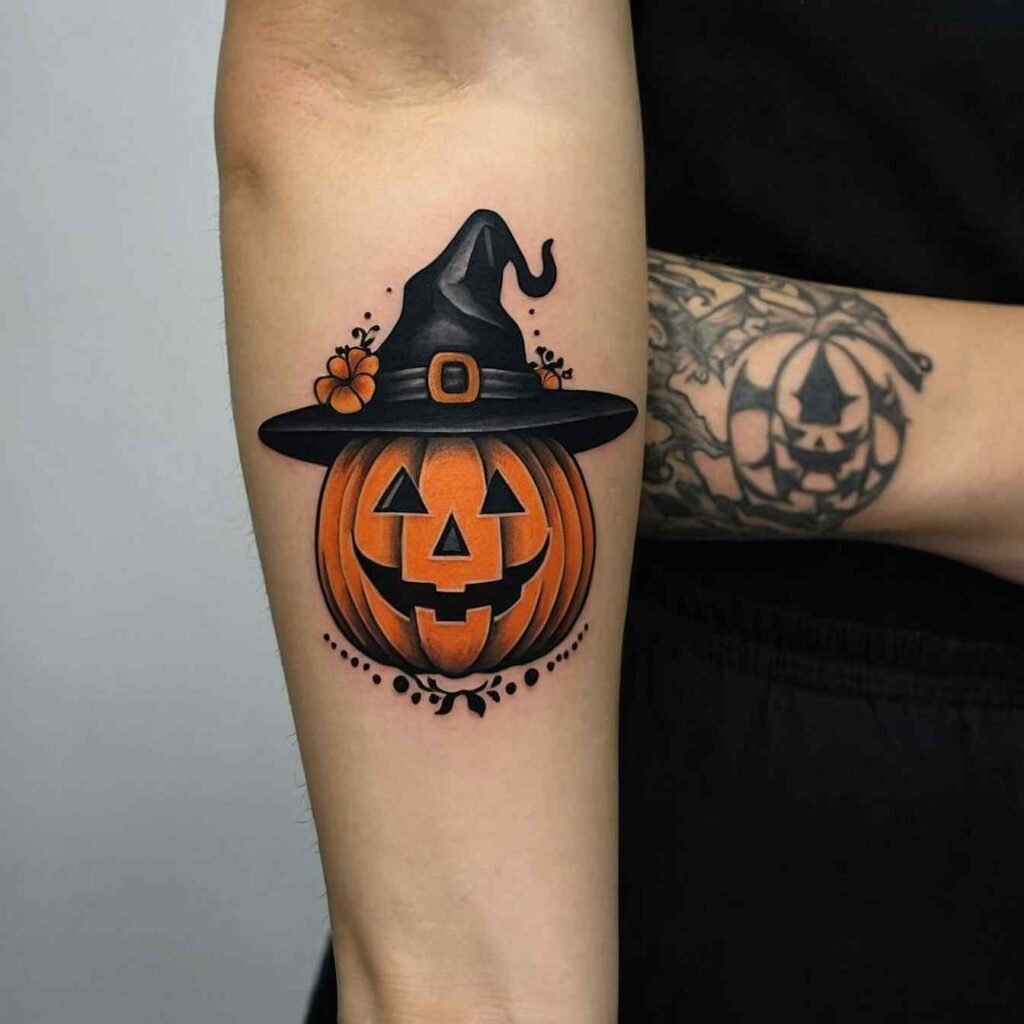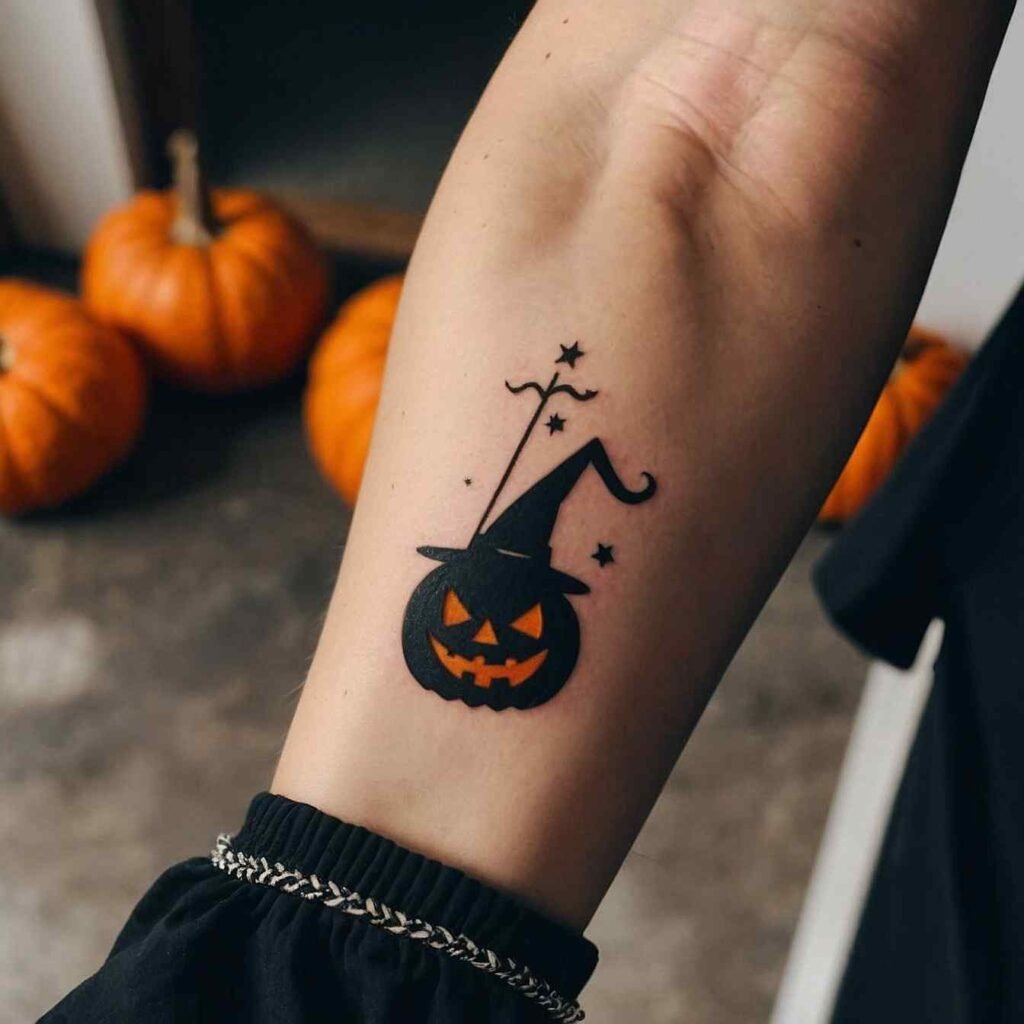A whimsical design that combines a witch hat with a pumpkin, this tattoo is perfect for capturing the fun and festive spirit of Halloween. The pumpkin adds a playful element to the classic witch hat, making this tattoo ideal for those who love the holiday and all its spooky traditions. It’s a lighthearted design that’s sure to bring a smile, making it a great choice for Halloween enthusiasts.