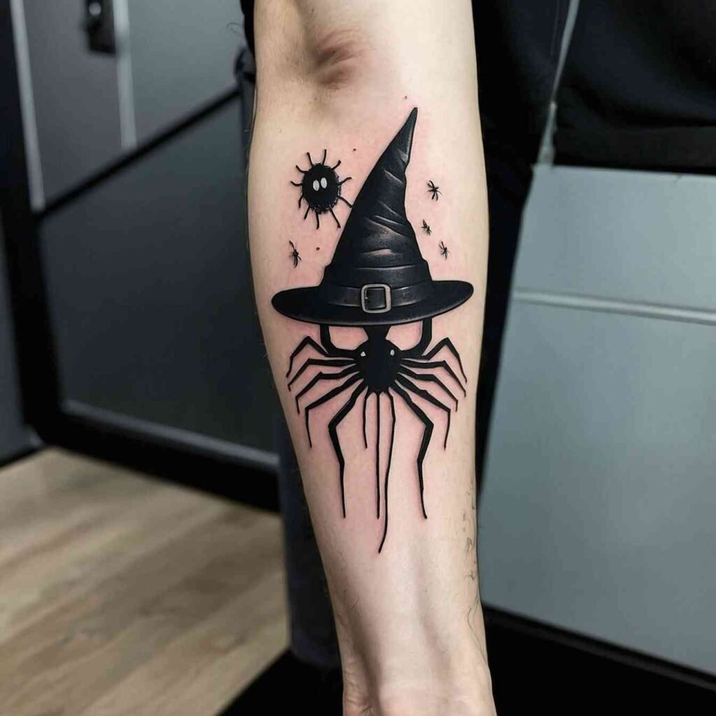 Adding spiders to your witch hat tattoo brings a darker, more intricate element to the design. Spiders symbolize transformation, creativity, and the interconnectedness of life. This tattoo is perfect for those who appreciate the more mysterious and sometimes eerie aspects of witchcraft. The spiders add a layer of complexity and depth, making the tattoo stand out with its unique blend of beauty and darkness.