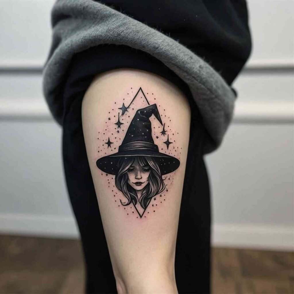 Combining a witch hat with crystals and stars creates a design that’s all about spiritual growth and protection. The crystals symbolize healing and energy, while the stars represent guidance and destiny. This tattoo is perfect for those who are on a spiritual journey and want to express their connection to the cosmos. The combination of elements makes this design both powerful and protective, with a touch of celestial beauty.