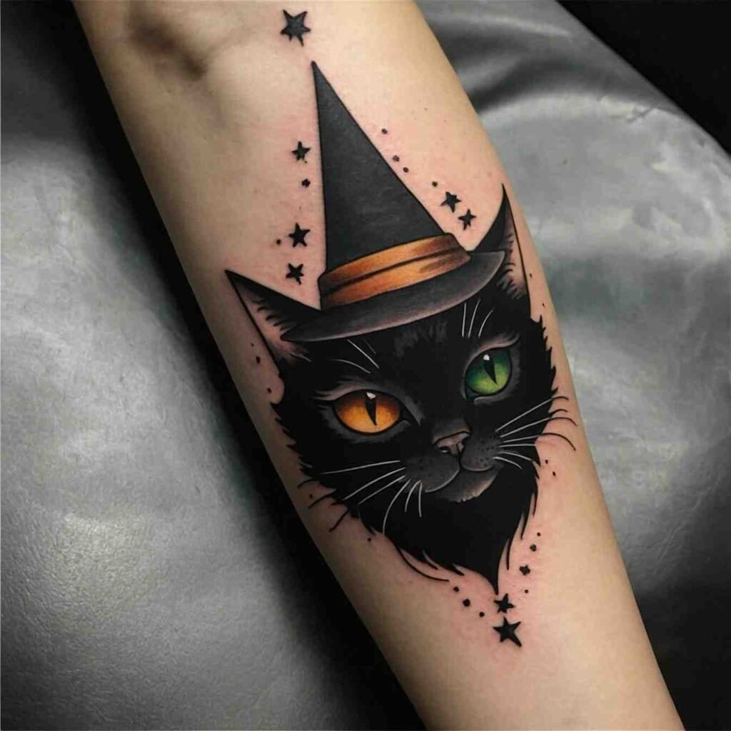 A classic symbol of witchcraft, a black cat alongside a witch hat represents companionship and mystery. This tattoo is perfect for cat lovers and those who appreciate the traditional imagery of witches. The black cat adds a playful yet mysterious element to the design, making it a great choice for anyone who wants a tattoo that’s both charming and rich in symbolism.