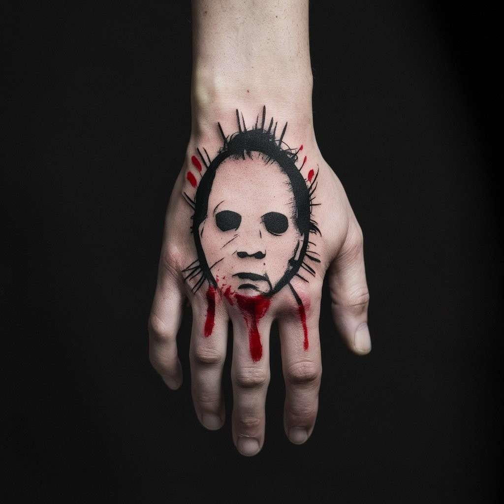 A tattoo of a bloody handprint with Michael Myers’ silhouette in the background creates a chilling image. The handprint represents violence, death, and the impact Michael leaves on his victims. It’s an intense design for those who want to showcase the brutality and terror of the character.