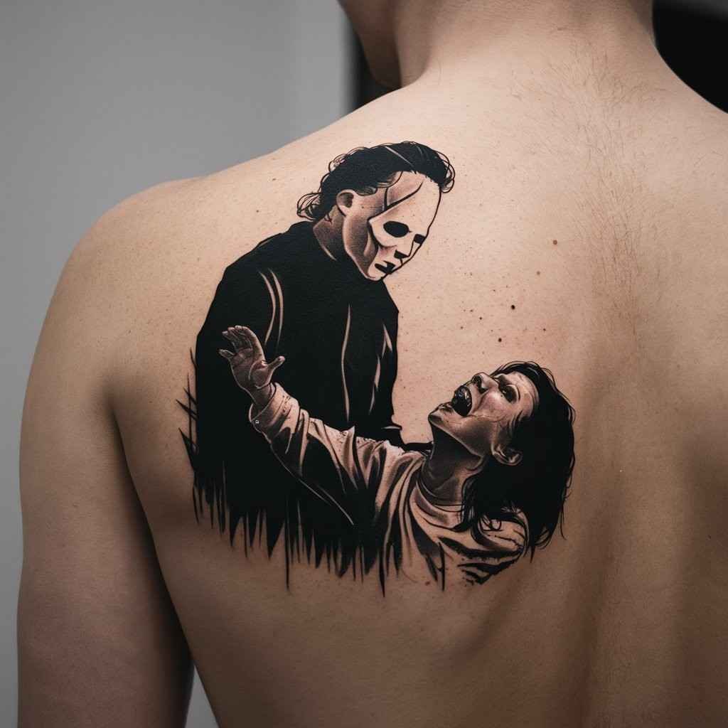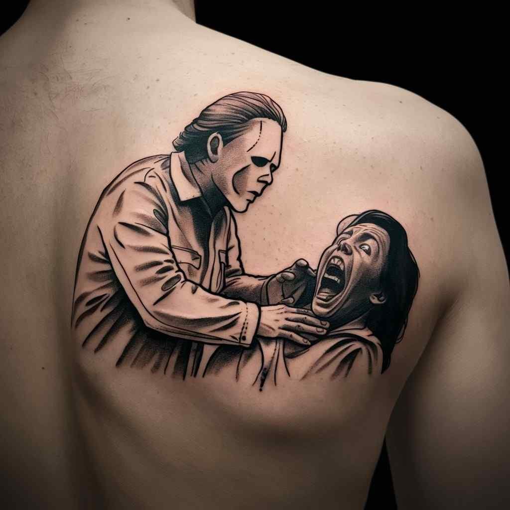 This tattoo shows a screaming victim with Michael Myers approaching. It symbolizes fear, helplessness, and the feeling of being pursued. It’s a bold choice for fans who appreciate the horror of being hunted and want a dramatic, emotional tattoo.