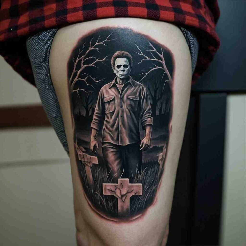 A tattoo showing Michael Myers in a graveyard creates an eerie, death-filled atmosphere. The graveyard symbolizes the end of life, while Michael’s presence represents the one who delivers death. This design is great for those who enjoy dark, Gothic themes and want to connect with the darker side of existence.