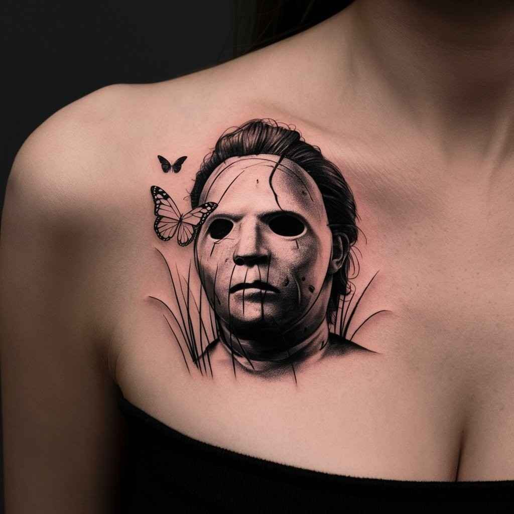 Combining Michael Myers with a butterfly adds an unexpected contrast. The butterfly symbolizes transformation and beauty, while Michael represents fear and death. This tattoo shows a balance between light and dark, making it a meaningful choice for those who believe in personal growth through facing their fears.