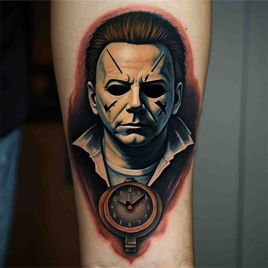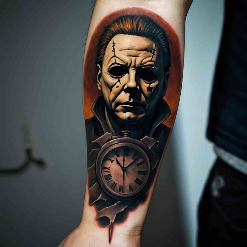 A tattoo combining Michael Myers with a clock symbolizes the unstoppable nature of time and death. Just as Michael is relentless in his pursuit, time never stops. This tattoo is ideal for someone who feels the weight of time and wants to symbolize the inescapability of fate.