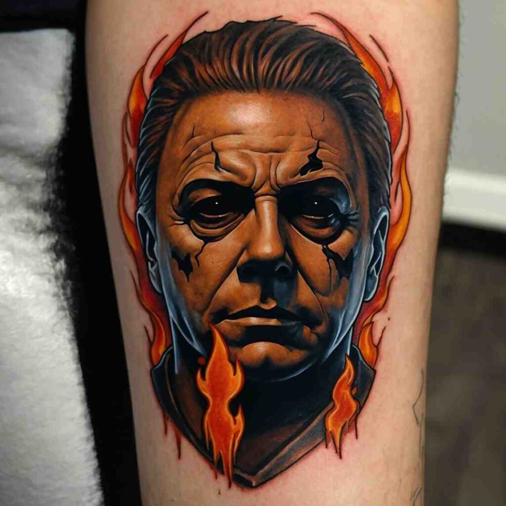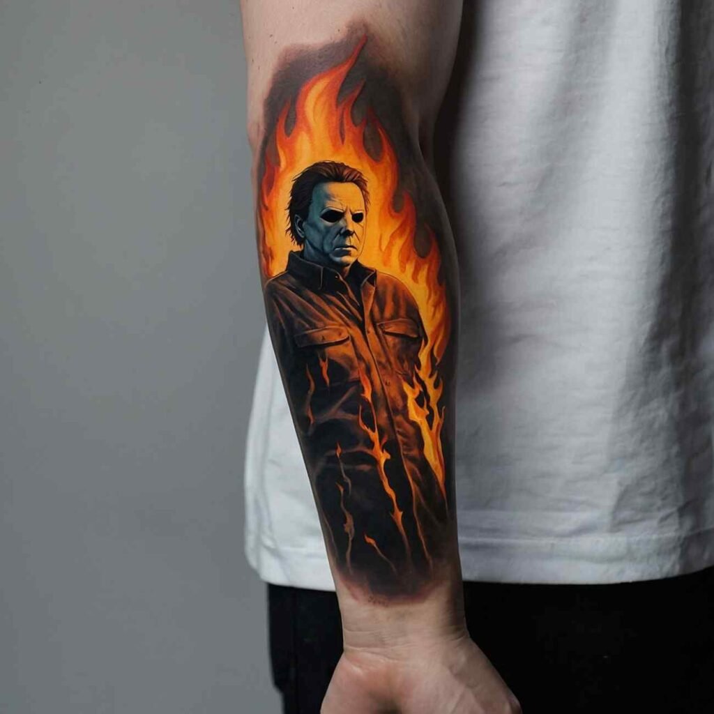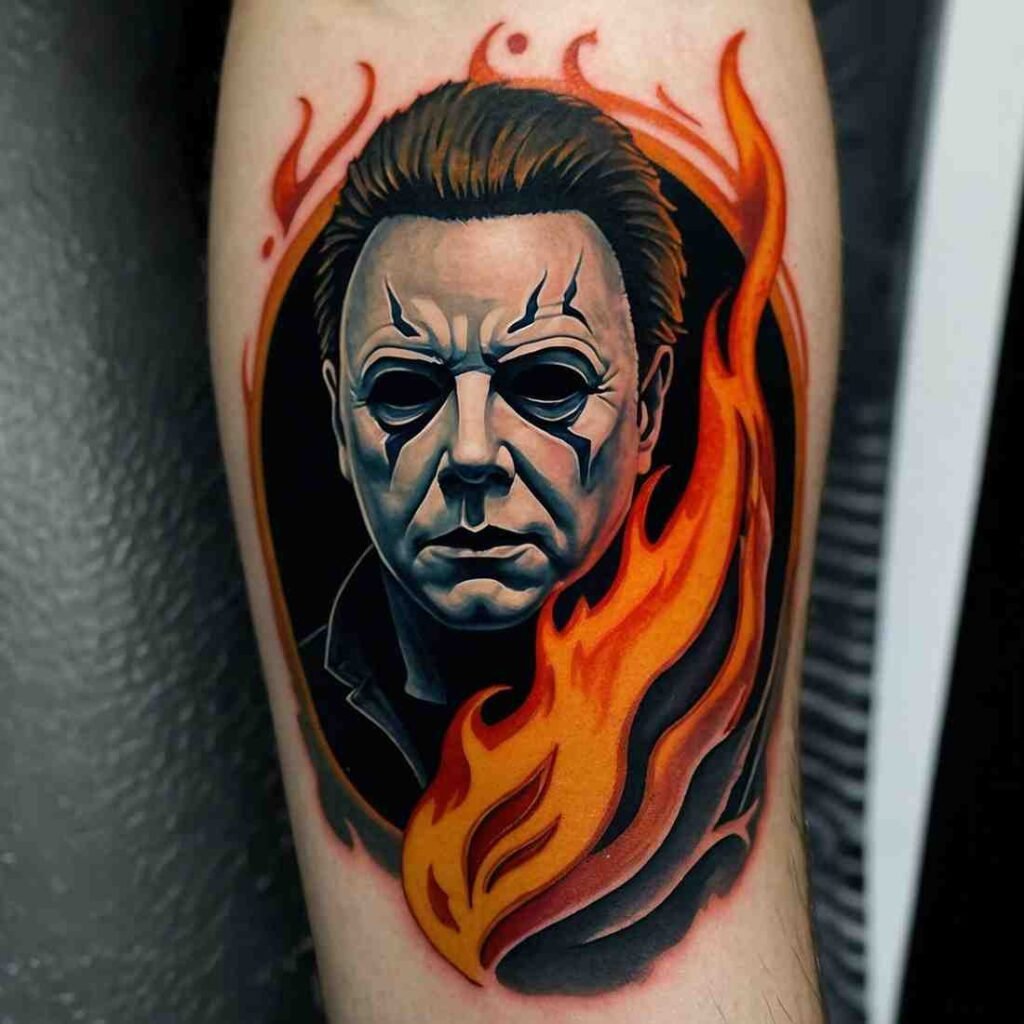A tattoo showing Michael Myers with flames or surrounded by fire represents destruction, chaos, and survival. Fire symbolizes both destruction and rebirth, and adding it to a Michael Myers design makes for a powerful tattoo. This is perfect for those who have gone through their own battles and come out stronger.