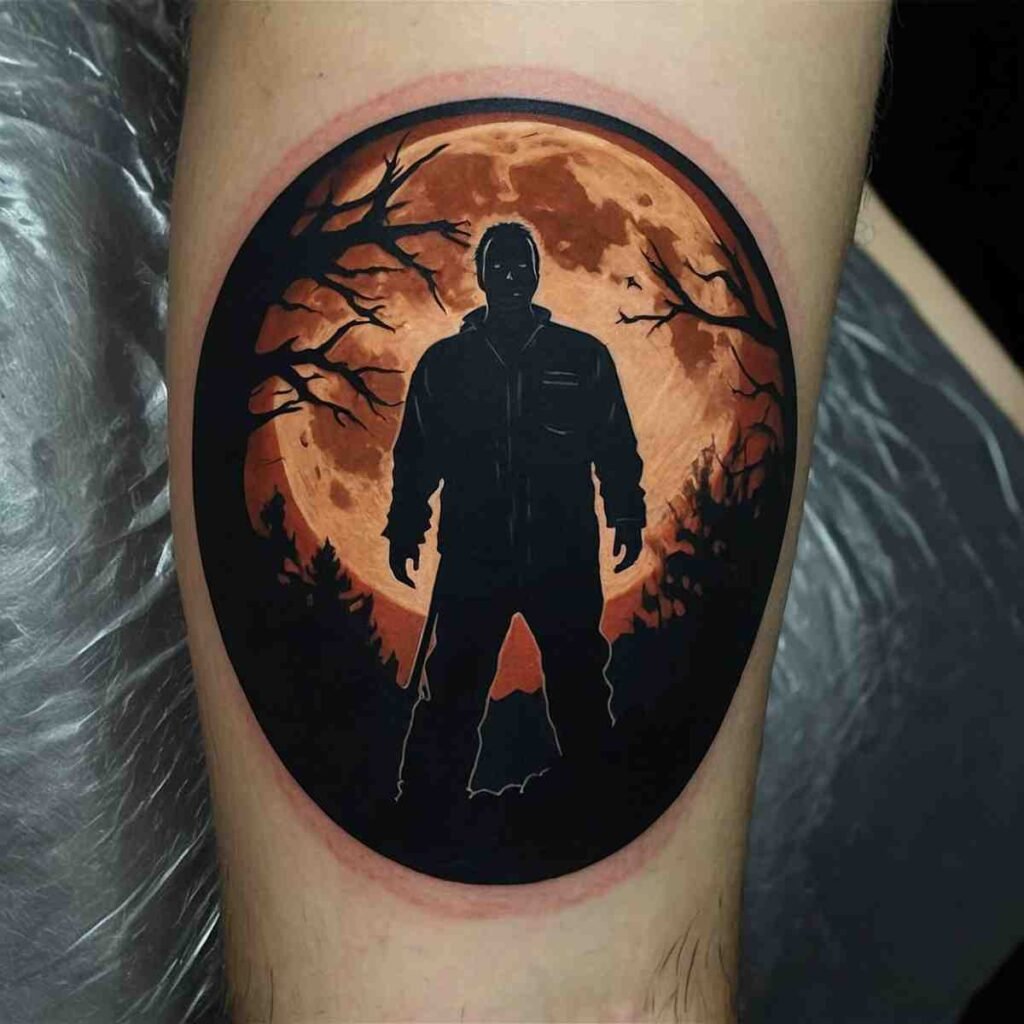 Adding a full moon to a Michael Myers tattoo gives it a supernatural, eerie vibe. The full moon is often linked to transformation, mystery, and night, while Michael represents fear and danger. Together, they make for a visually striking tattoo that blends elements of horror and nature.