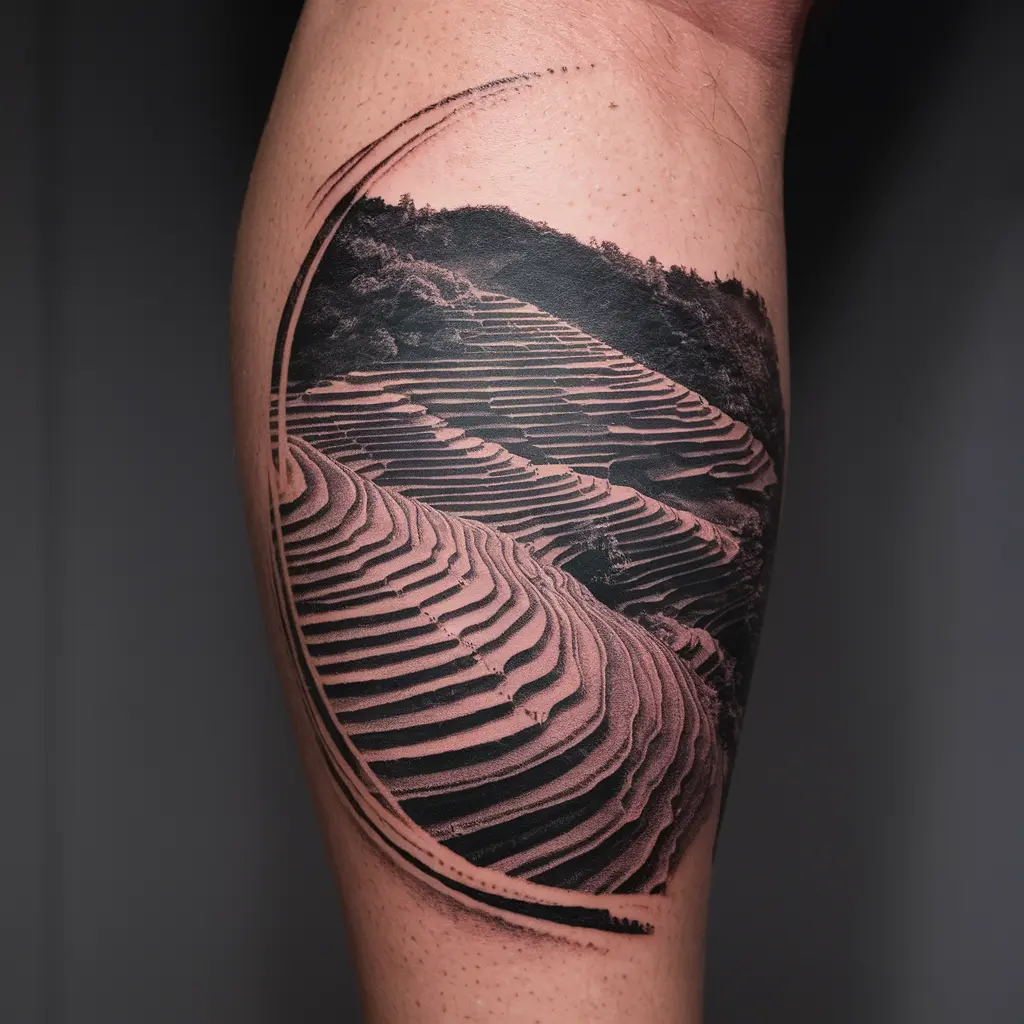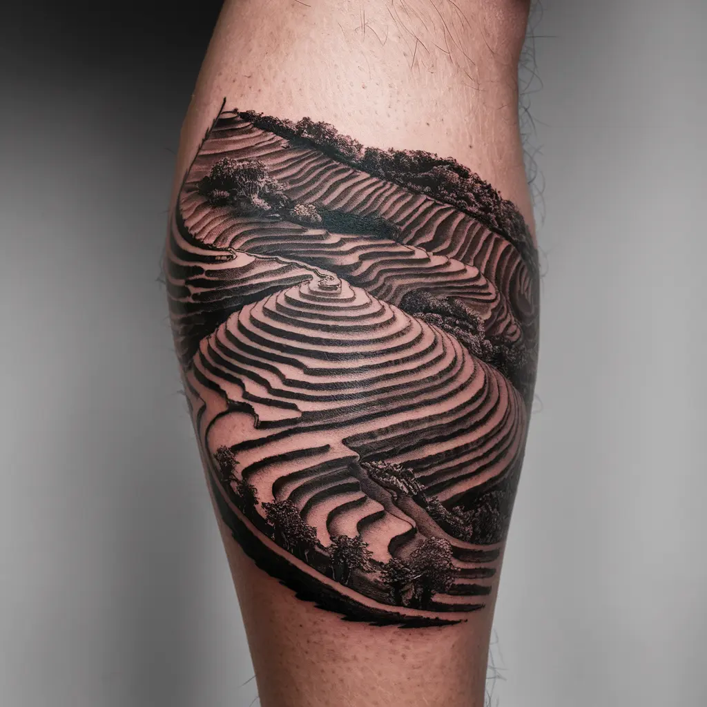 The Ifugao Rice Terraces are a UNESCO World Heritage Site and represent the ingenuity of the Filipino people. A tattoo of the terraces signifies harmony with nature, resilience, and hard work.