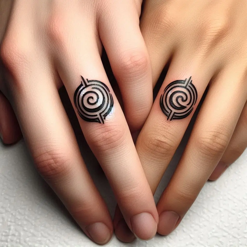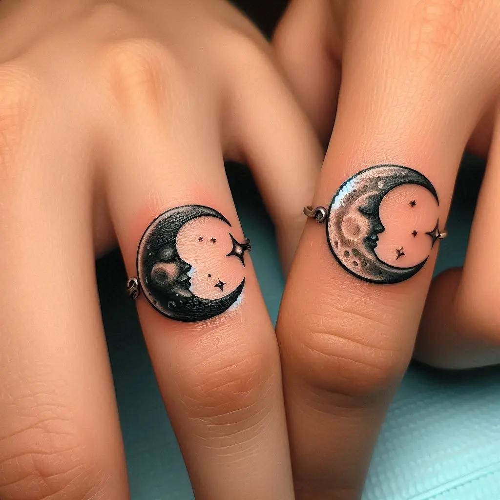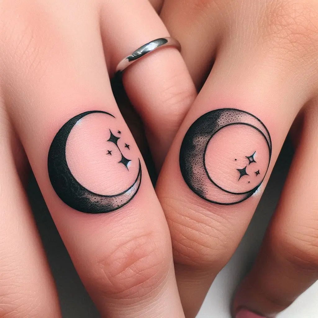 A crescent or full moon tattoo on each partner’s ring finger can be a romantic and mystical choice. The moon symbolizes cycles, change, and constancy all at once—perfect for couples who embrace both the calm and turbulent moments in their relationship.