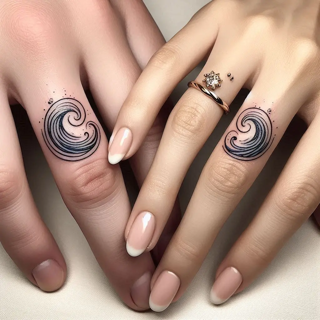 If you and your partner are lovers of the sea or nature, matching wave tattoos might be a beautiful and meaningful choice for your wedding ring fingers. Waves can be as subtle or bold as you like. These tattoos symbolize the ebb and flow of life, the calm, and the storms.