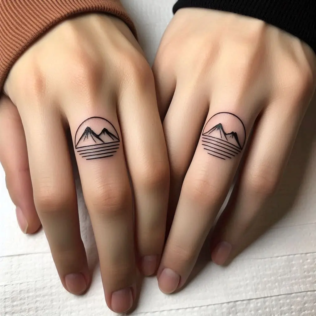 A mountain range tattoo on the wedding ring finger represents strength, stability, and the journey through life together. It’s a symbol of the high peaks and low valleys that couples experience but continue to climb together.