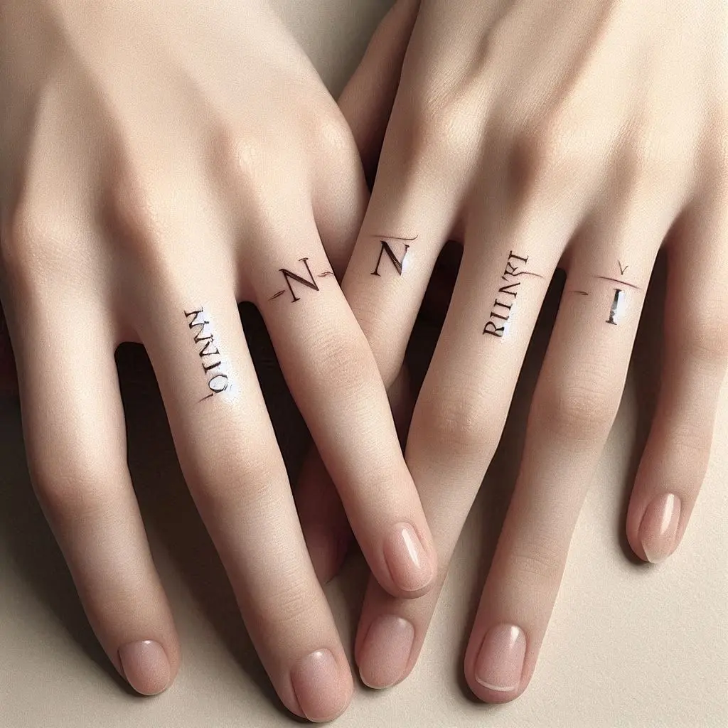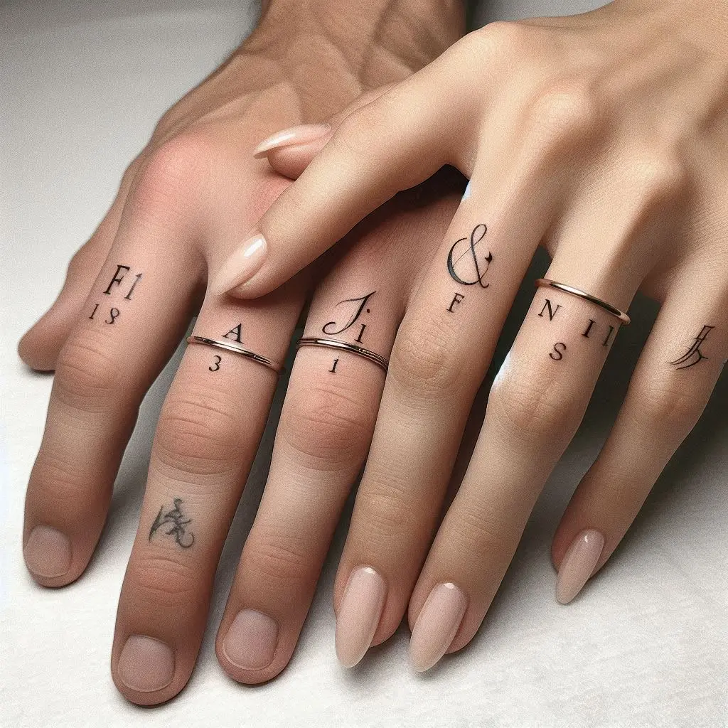 A simple and personal option is to tattoo each other’s initials or first names on your ring fingers. This intimate choice allows you to carry a piece of your partner with you always.